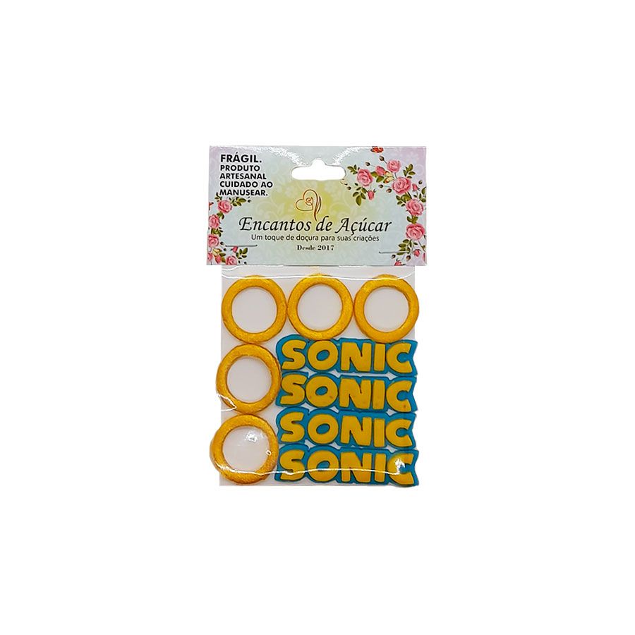 Um pacote contendo 9 unidades de confeito de açúcar com formato dos aneis e nome do Sonic.