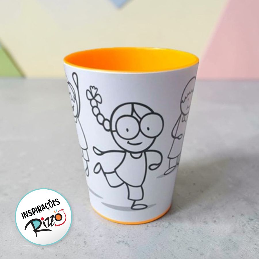 Um copo da cor larnja com desenhos para serem coloridos com giz de cera