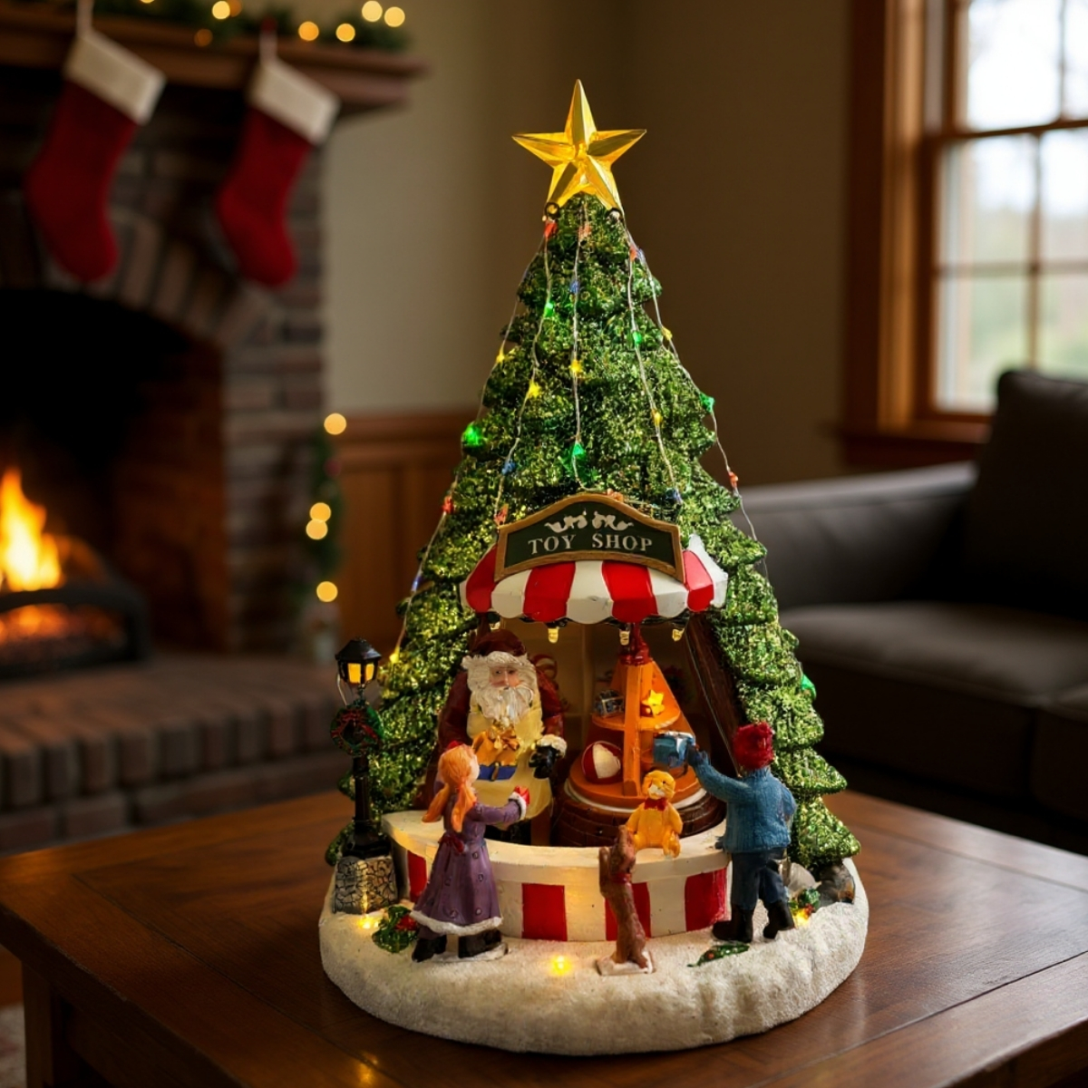 A decoração imita uma loja de natal, dentro de uma árvore de natal, onde papai noel é o comerciante. Os detalhes estao em vermelho e branco listrado, e a estrela no topo da árvore é amarela.