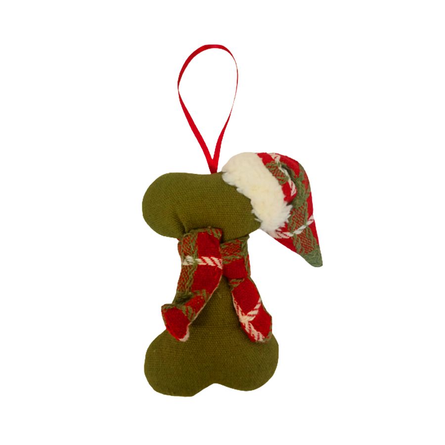 Enfeite de pendurar natalino, osso com gorro, na cor verde e detalhes xadrez.