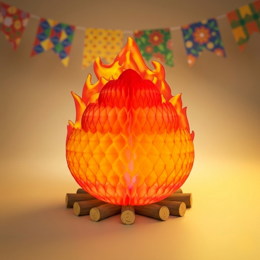 Produzida em papel de seda leve e delicado, a fogueira possui estrutura em formato colmeia expansível, que facilita a montagem e garante um efeito visual volumoso e atrativo. Com medidas aproximadas de 14 cm de largura e 20,5 cm de altura, é ideal para uso como luminária decorativa (sem contato direto com fogo) ou como enfeite suspenso em tetos e espaços internos. Seu design versátil permite combinar com outros elementos típicos, criando uma decoração harmoniosa, criativa e totalmente temática para festas juninas, eventos escolares e comemorações especiais.