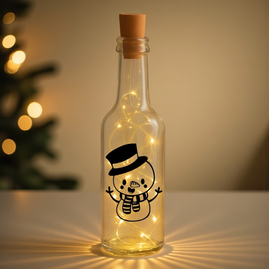 Garrafa de vidro com um vinil adesivo personalizado. Contém uma rolha com fio de LED para colocar no interior da garrafa. LED com função liga e desliga. Adesivo removível. Limpar com delicadeza para não danificar o vinil.
