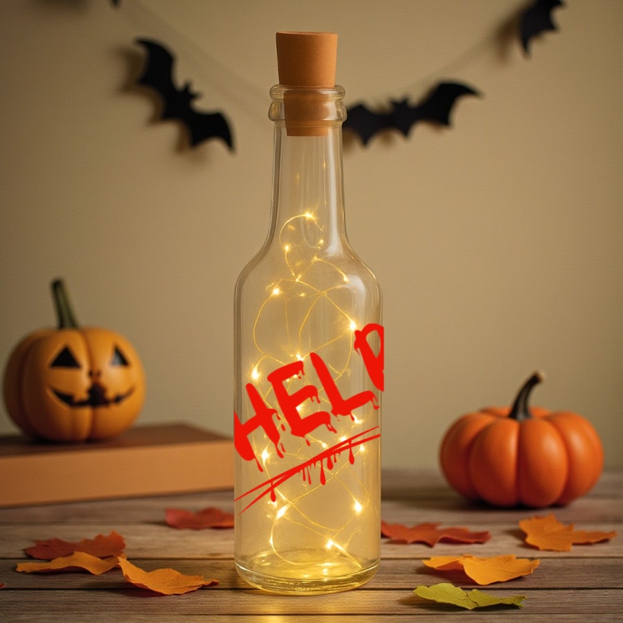 Garrafa de Vidro Long Neck com Rolha LED temática de Halloween: "HELP". Essa criação sinistra incorpora a imagem de um pedido de socorro em meio ao terror, com um adesivo que simula o gotejamento de sangue, transmitindo uma sensação de desespero. A rolha com LED lança uma luminosidade pulsante, intensificando a atmosfera enigmática, o que a torna um acréscimo impactante para festividades e decorações de Halloween.