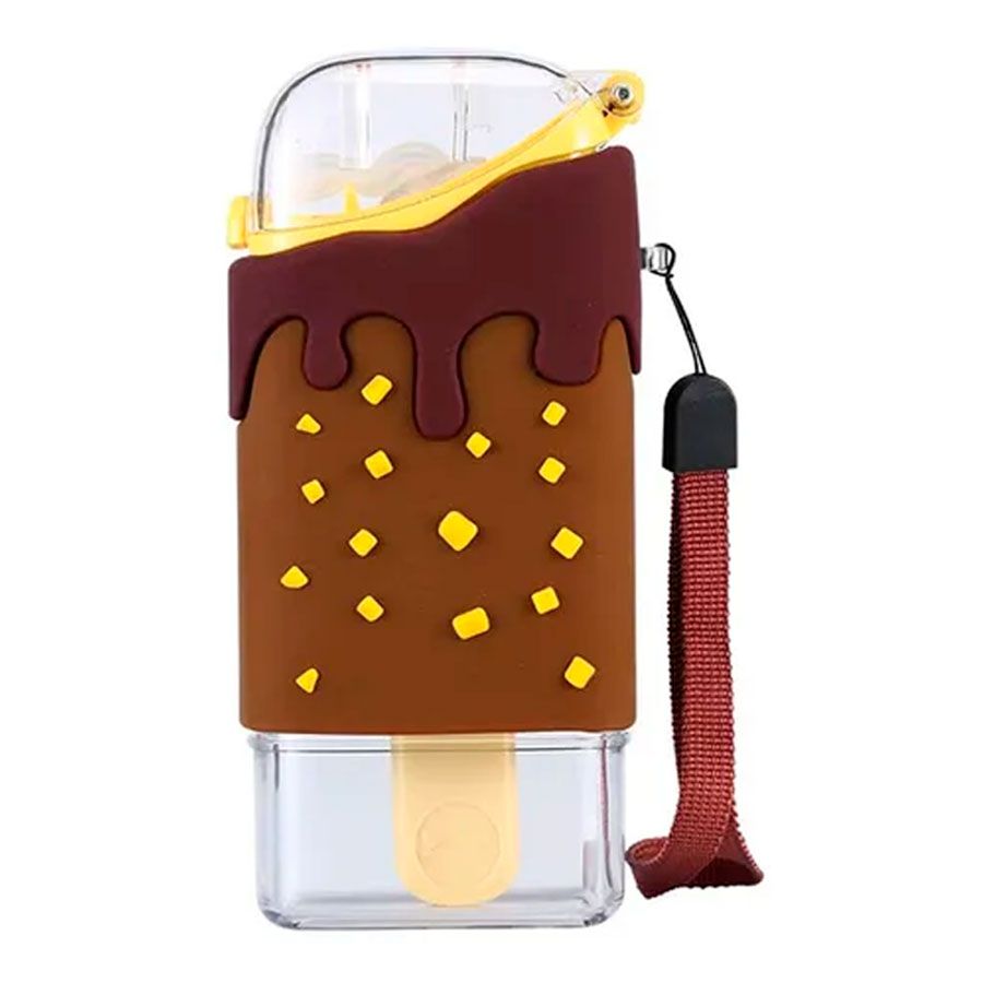 Uma garrafa de água de 300ml na cor marrom e branco com trava e cordão para pendurar no pescoço com um fecho de plástico com 92 centímetros em formato de picolé com granulado