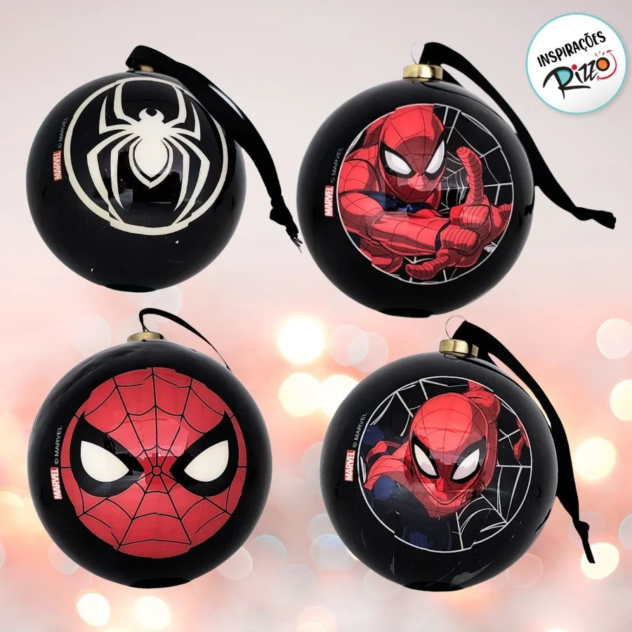 Transforme sua árvore com o estilo heróico do Homem Aranha Marvel. Este kit inclui 4 bolas de Natal com 8 cm de diâmetro, trazendo estampas inspiradas no visual clássico do herói, perfeitas para adicionar ação e personalidade à sua decoração natalina.