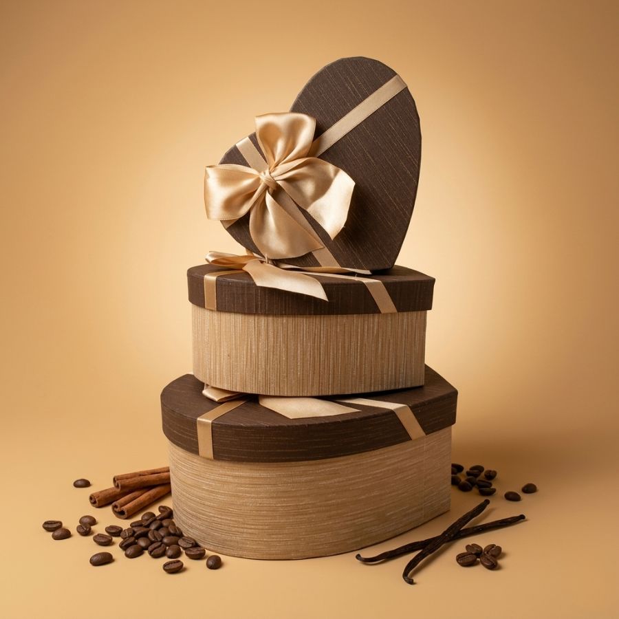 Kit de 3 caixas de papel rígido em formato de coração, bege com tampa marrom e laço bege. Perfeito para presentear com chocolates, doces ou pequenos itens, oferecendo charme, sofisticação e versatilidade.