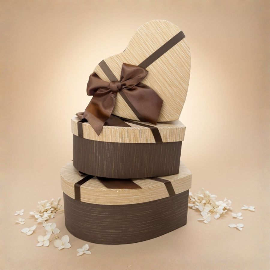 Kit de 3 caixas de papel rígido em formato de coração, marrom com tampa bege e laço marrom. Ideal para presentear com chocolates, doces ou pequenos itens, oferecendo sofisticação, charme e versatilidade.