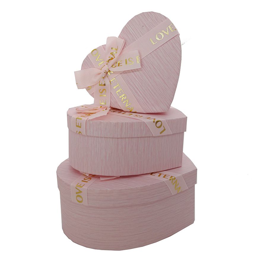 O kit possui 3 caixas papel rígido coração na cor rosa com laço rosa e dourado e medem Caixa 1: 15 cm x 13 cm | Caixa 2: 18 cm x 16 cm | Caixa 3: 21 cm x 19 cm