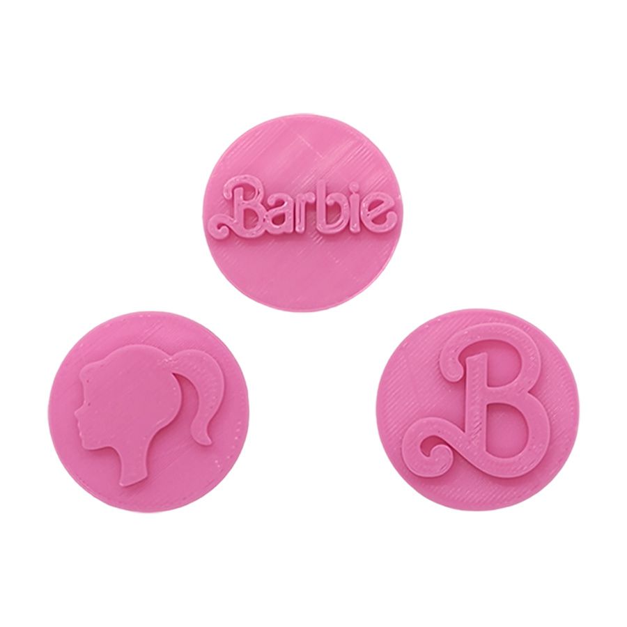 Boneca: 3 cm Largura x 2,7 cm Altura | B: 3 cm Largura x 3 cm Altura | Barbie: 3,8 cm Largura x 1 cm Altura