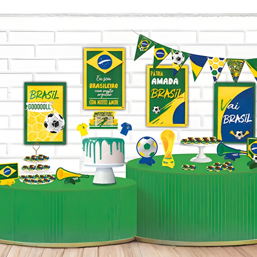 Kit de festa com o tema do Brasil e da Copa do Mundo de 2022. Contém: 4 quadros, 6 decorações de mesa, 1 faixa decorativa, 3 topos de bolo, 40 porta forminhas