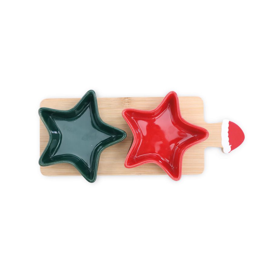 Kit Prato em formato de estrela com bandeja de Natal. Cores verde e vermelho.