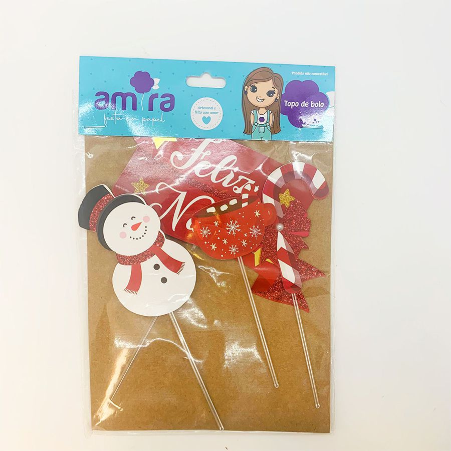 O kit possuí 4 topos para bolos, contendo um topo de boneco de neve de papel branco, com cachecol vermelho e cartola preta, um topo escrito "Feliz Natal" em branco e a plaquinha da cor vermelha com estrelas douradas. O topo de bengala doce e de xícara possuem a cor vermelho e branco.