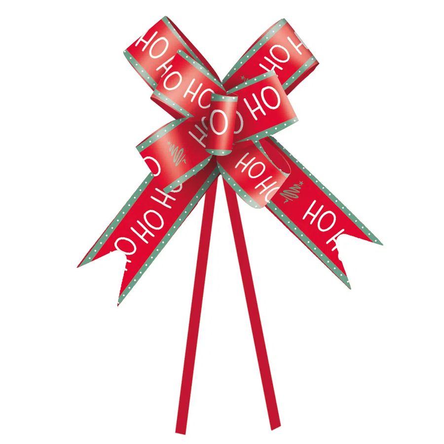 O laço da cor vermelha possuí bordas verdes com bolinhas brancas,desenhos de pinheiro verde e a frase "HO HO HO" escrito na cor branca.