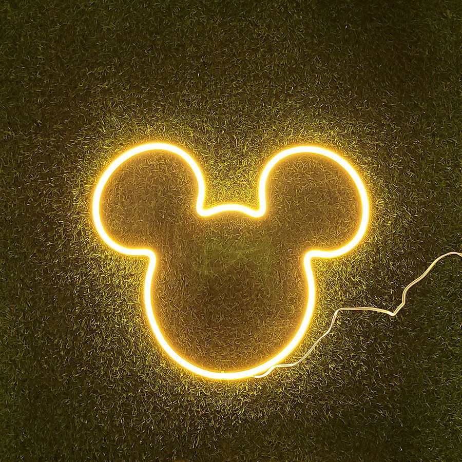 Um Painel Acrílico 3mm, tendo as dimensões de 44,1cm de largura por 39,7 de altura com formato do Mikey Mouse e mangueira led neon na cor amarelo tendo as dimensões de 43,1cm x 39,7cm acompanhando fonte 12v bivolt