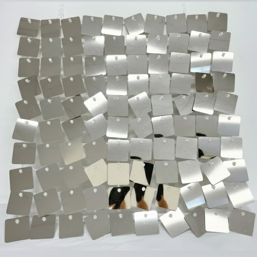 O painel possuí parafusos com quadradinhos pendurados dando efeito de cortina com movimento da cor prata.