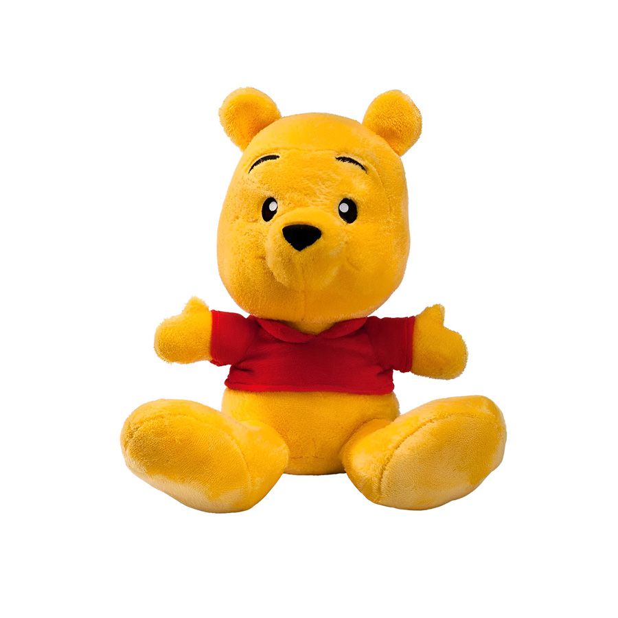 Pelúcia do Ursinho Pooh do desenho do mesmo. Cor amarela, camiseta vermelha. Mede 30 cm de altura e 15 cm de largura.