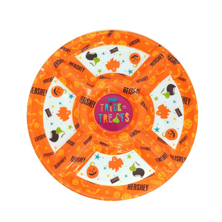 Petisqueira com 5 divisórias, predominantemente laranja e com detalhes em branco, também possui desenhos de Halloween.