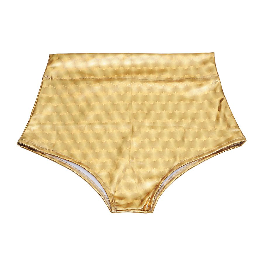Shorts tipo Hot Pant, com o design brilhante na cor dourada.