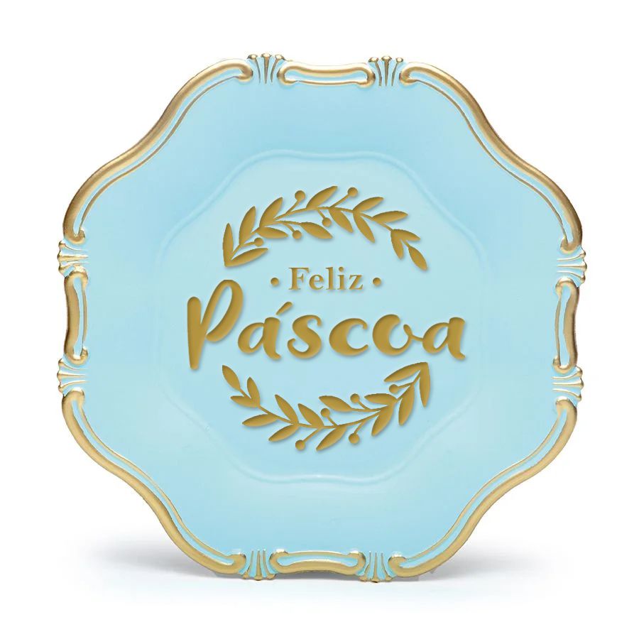 Sousplate decorativo com o adesivo “Feliz Páscoa” em letras douradas. Ideal para decorar mesas, estantes e armários em sua cozinha ou sala de jantar. Obs.: cuidado para não remover o vinil, limpar delicadamente.