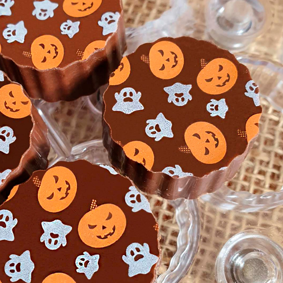 Folha para transfer de chocolate para usos em diversos formatos. Tempere o chocolate conforme as instruções do fabricante. Aplique sobre a folha (você pode cortá-la e aplicar em outras formas, para ter o chocolate no formato que desejar e com as belas estampas). Deixe na geladeira por, ao menos, 20 minutos antes de tentar remover o plástico - o tempo pode ser maior se você estiver modando chocolate maior. O plástico possui impressões de abóboras de Halloween (Jack O'Lantern) e caveirinhas em pigmentos comestíveis que ficarão impressos no chocolate