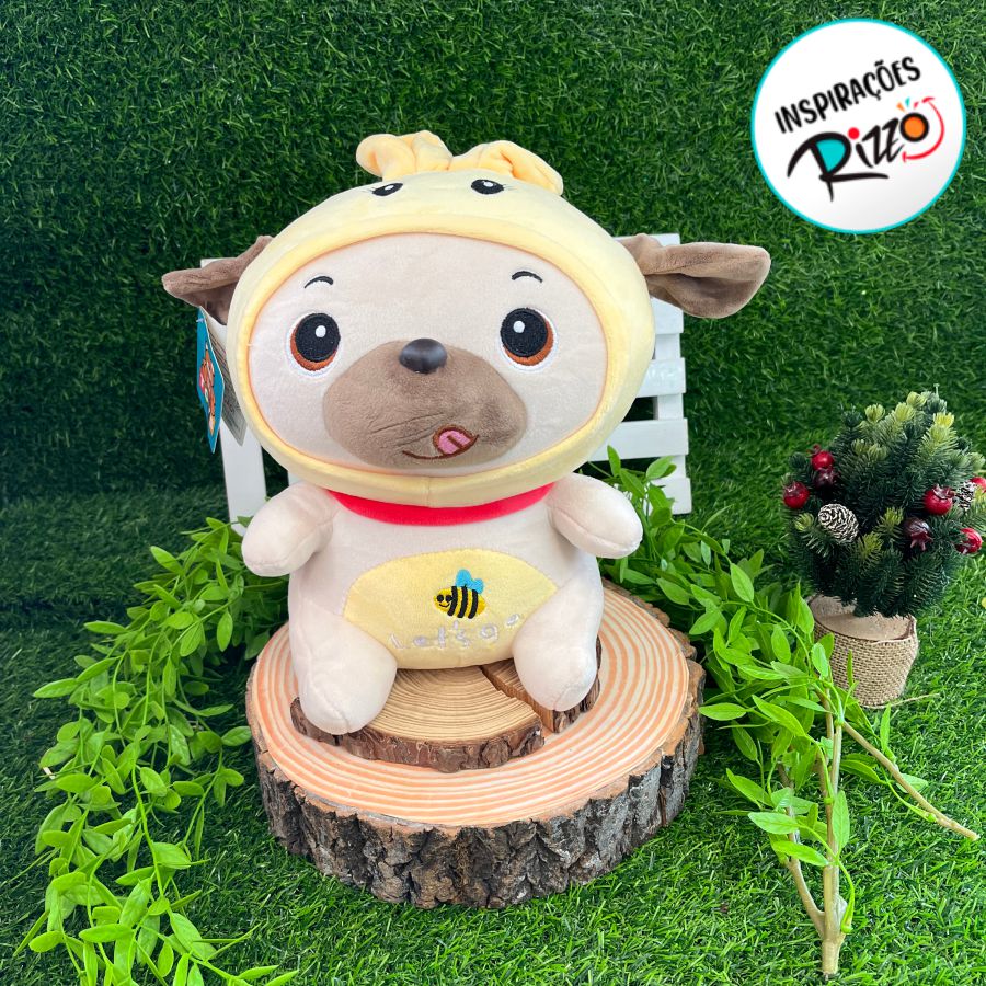 Pug de pelúcia fantasiado de abelha amarelo, com 30 cm. Uma peça divertida e charmosa, ideal para dar um toque alegre e único à sua decoração.