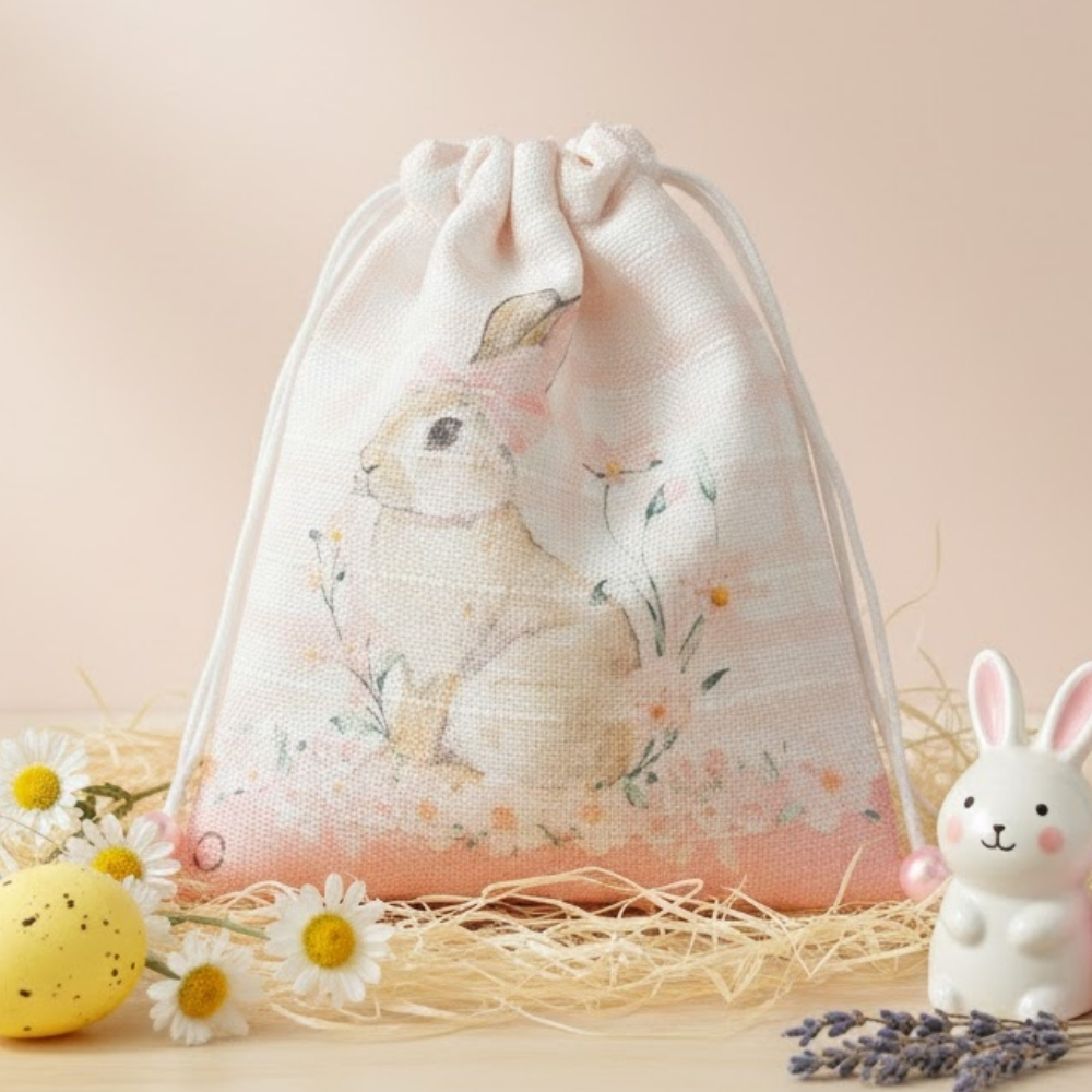 Confeccionado em algodão, o saco é leve, resistente e reutilizável, ideal para acomodar pequenos itens com delicadeza. No tamanho 14x12cm, é perfeito para lembrancinhas de Páscoa, mini chocolates, doces artesanais e pequenos mimos, valorizando a apresentação com um toque artesanal.