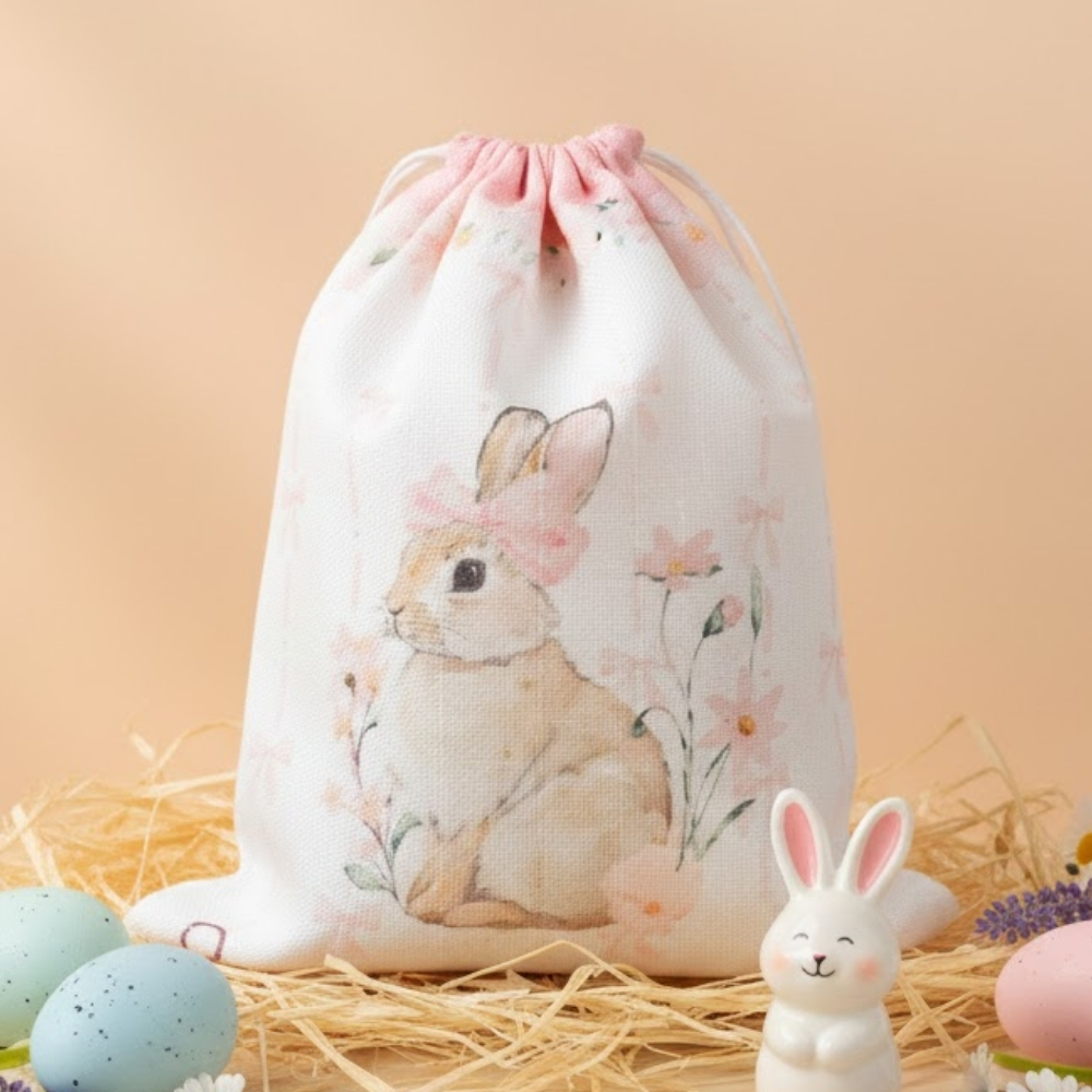 Delicado e encantador, o saco de algodão Candy Rosa é ideal para composições suaves e temáticas de Páscoa. Com fundo branco e estampa xadrez rosa, a peça apresenta um visual doce e clássico. A estampa traz um coelhinho com flores, criando uma composição harmoniosa, leve e romântica, perfeita para lembranças delicadas.