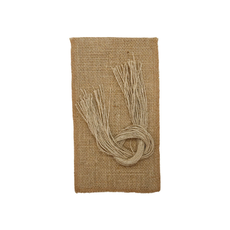Saco em juta medindo 17x30cm, acompanhado por fio em juta para o fechamento do saco