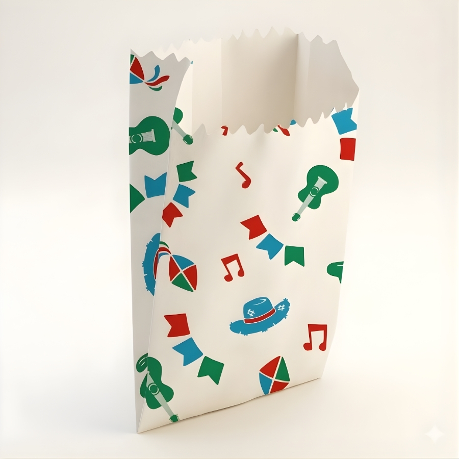Saco fabricado em papel com estampa temática de ícones de Arraiá. Possui dimensões aproximadas de 8,5x20cm. Indicado para acondicionar alimentos secos, doces ou lembrancinhas em festas juninas e eventos temáticos. Produto descartável. Recomenda-se evitar contato com líquidos ou umidade para preservar a integridade do papel.