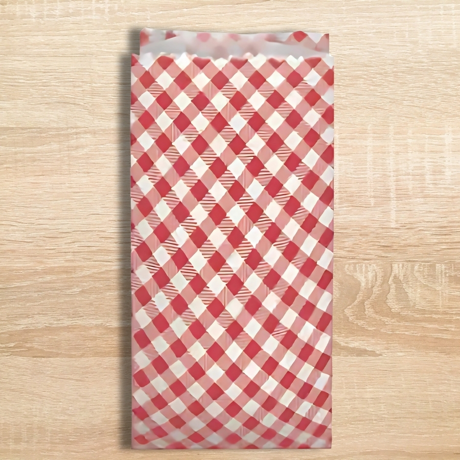 Saco de papel com estampa xadrez vermelho, tamanho 7,5x18cm, ideal para embalar doces e lembrancinhas em festas juninas.