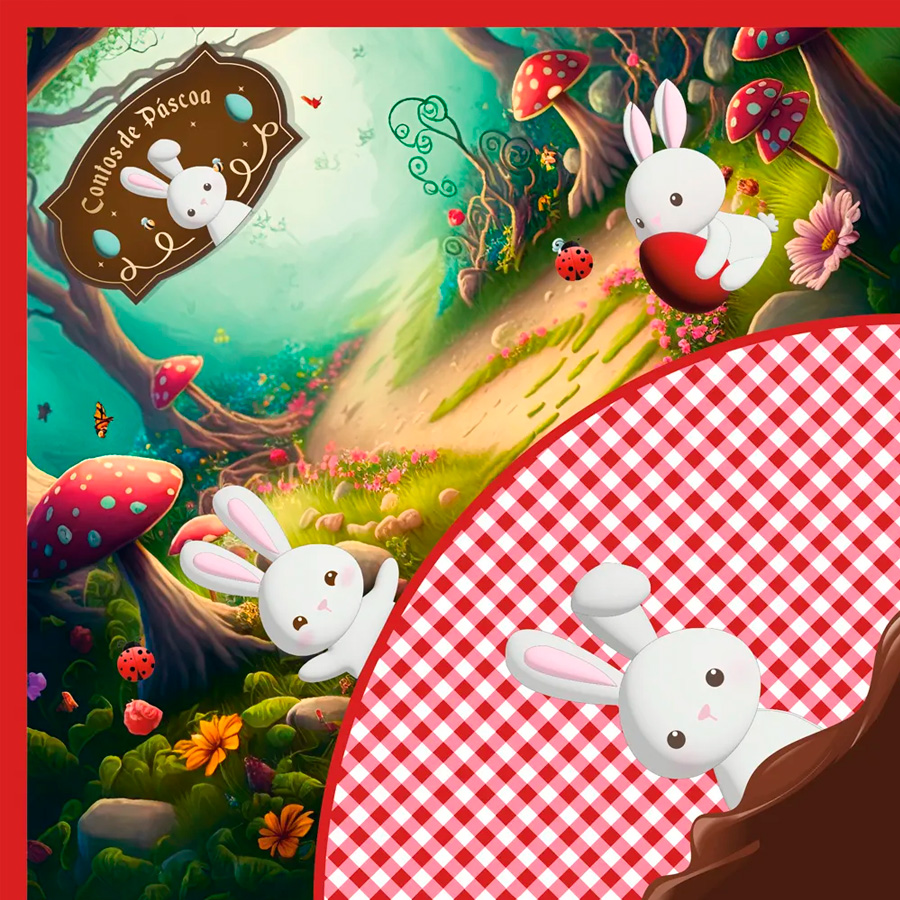 Saco Express vermelho "Contos Páscoa", tamanho 32x32 cm, ideal para embalar ovos de Páscoa de 150g a 200g com charme e praticidade.