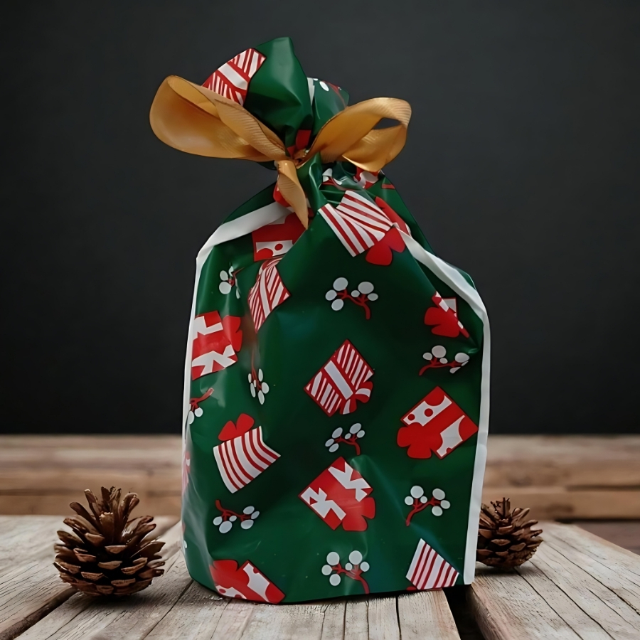Com estampa de presentes sobre fundo verde vibrante, este saco plástico adiciona charme e sofisticação às suas produções. Perfeito para doces, chocolates, lembrancinhas escolares, bijuterias ou pequenos brindes, ele valoriza o presente e garante um acabamento bonito e profissional em qualquer ocasião natalina.
