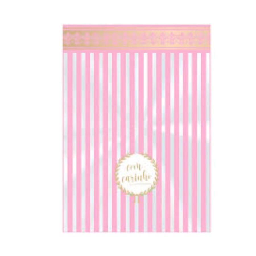 Saquinho transparente na cor rosa listrado, com selo de ''Com Carinho''