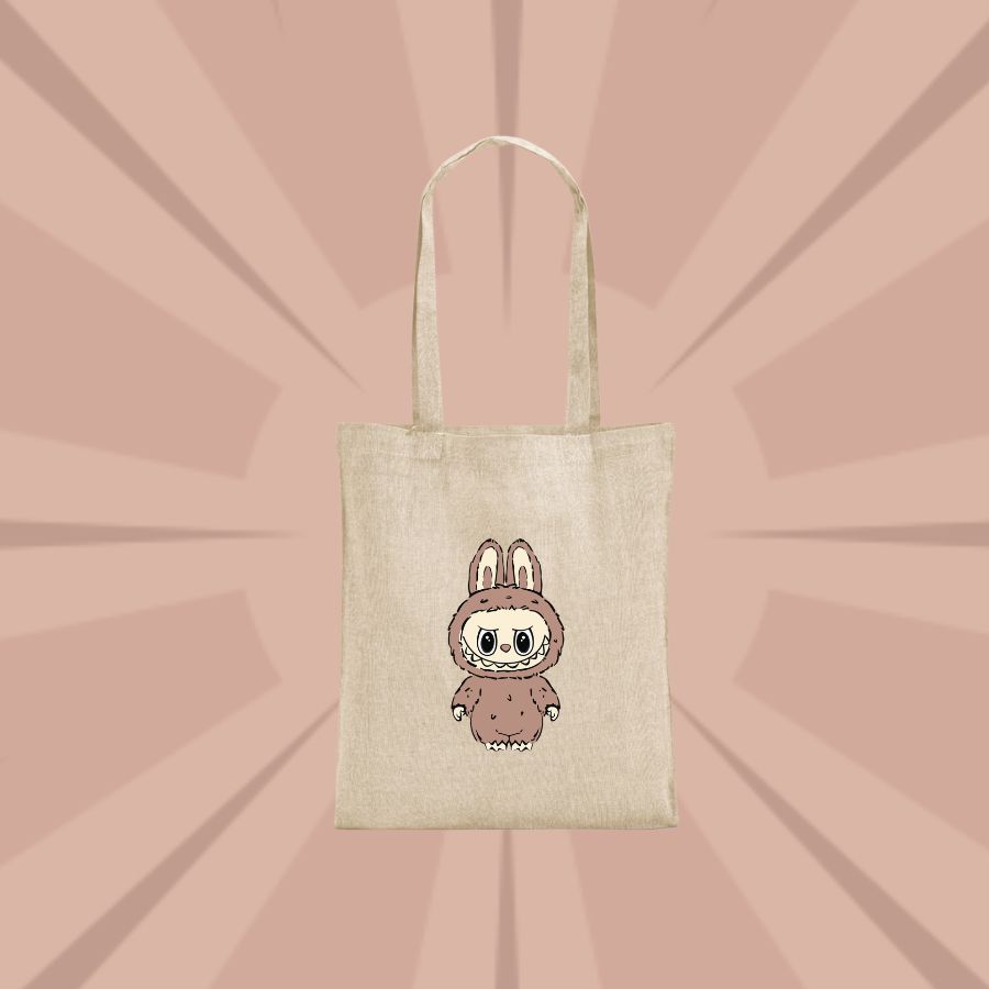 Sacola de algodão reciclado bege com estampa do personagem Labubu em quatro opções de cor. Modelo resistente e sustentável, tamanho 38x40cm, ideal para uso diário.