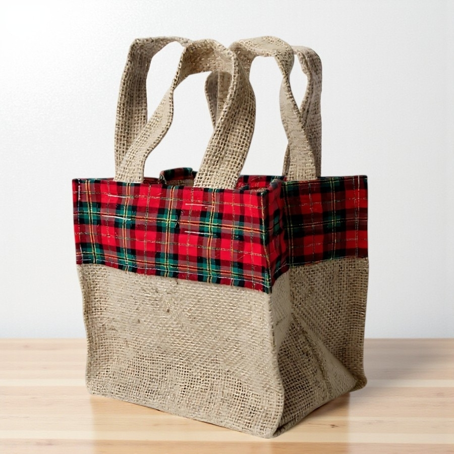 Cesta de juta natural para panetone, com alça e acabamento em tecido vermelho xadrez. Medidas: 17x15x20cm. Produto resistente, reutilizável e sustentável, ideal para presentes natalinos e cestas personalizadas.