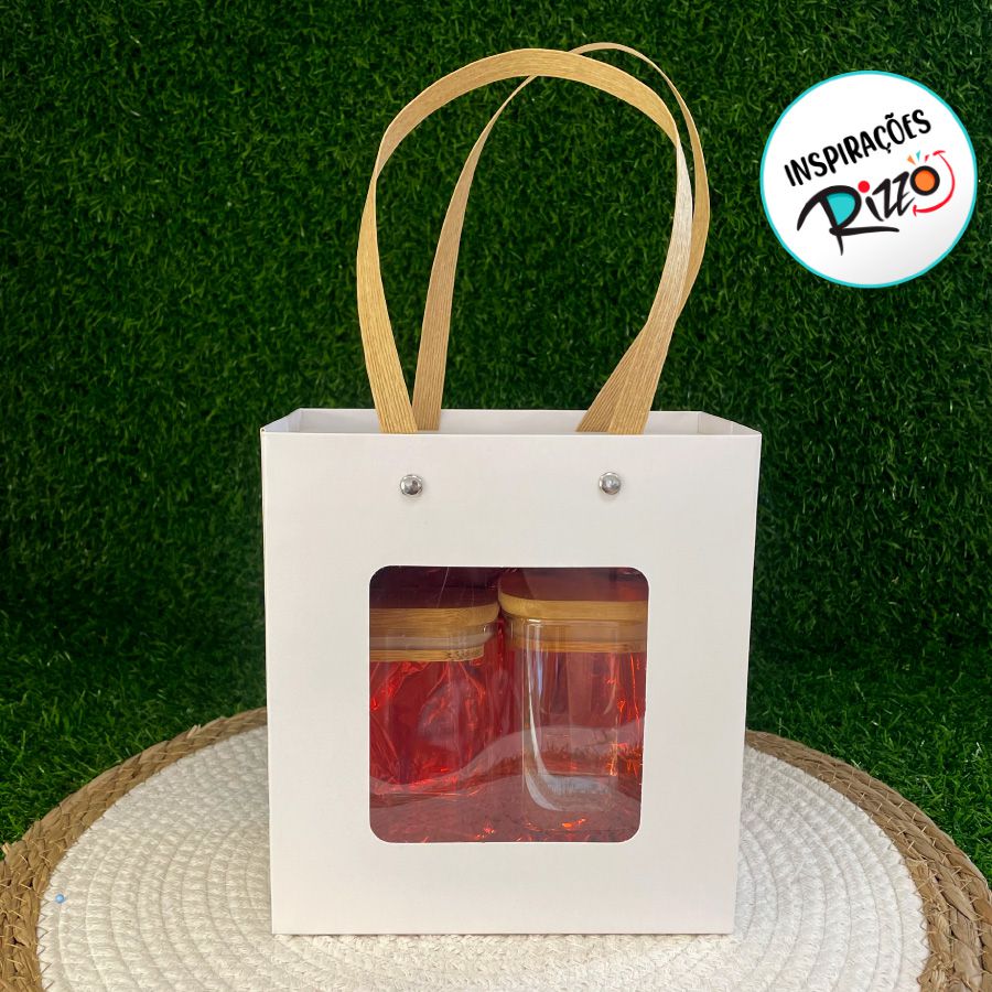 Sacola de papel branca com gaveta e visor, alça de papel imitando palha
