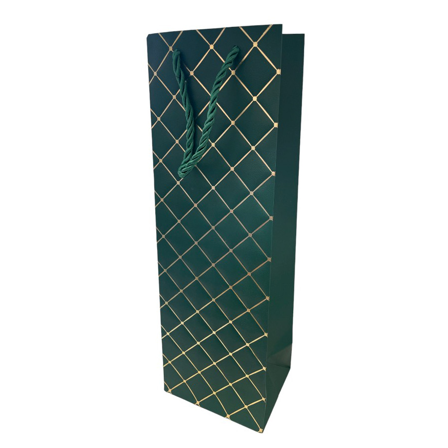 Sacola para garrafas e bebidas, na cor verde escuro com textura almofadada e detalhes de desenhos quadriculados em dourado.