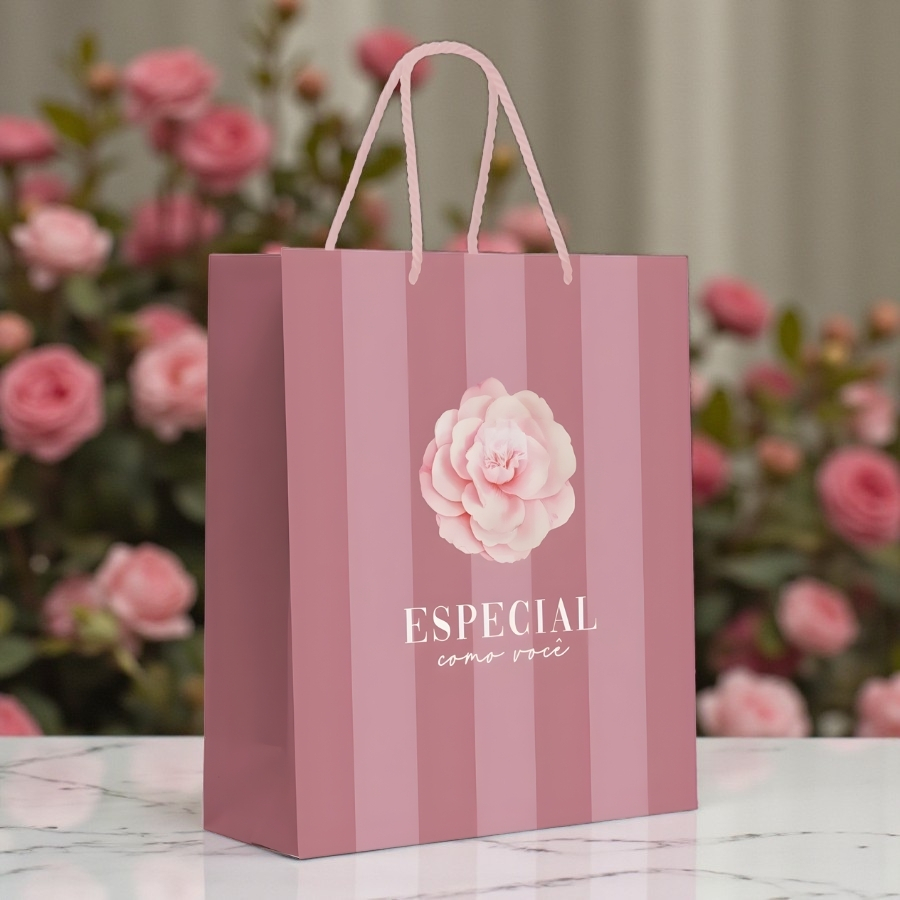 A Sacola de Papel Premium – Camélia é resistente, elegante e sofisticada, ideal para presentes especiais e produtos de qualidade. Seu design é inspirado na flor Camélia e pode ser personalizado com laços e tags.