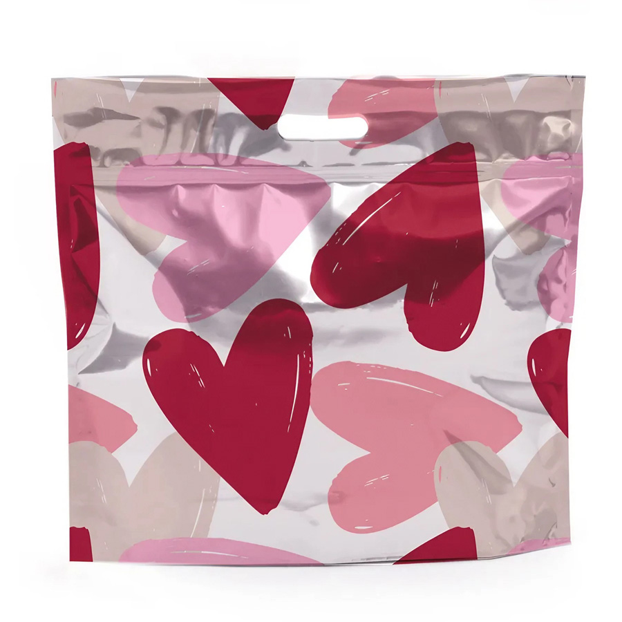 Sacola metalizada com zip tema passione com corações nas cores vermelho, nude, rosa e rosa claro