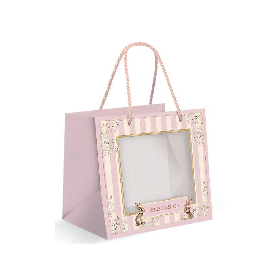 Sacola Premium Para Caixa Meio Ovo com Visor - ideal para Doce Páscoa, com dimensões de 30x26x14cm, perfeita para acomodar a caixa de meio ovo com estilo e segurança. O visor transparente exibe o meio ovo de chocolate de maneira atraente e sofisticada, proporcionando uma ótima apresentação do produto.