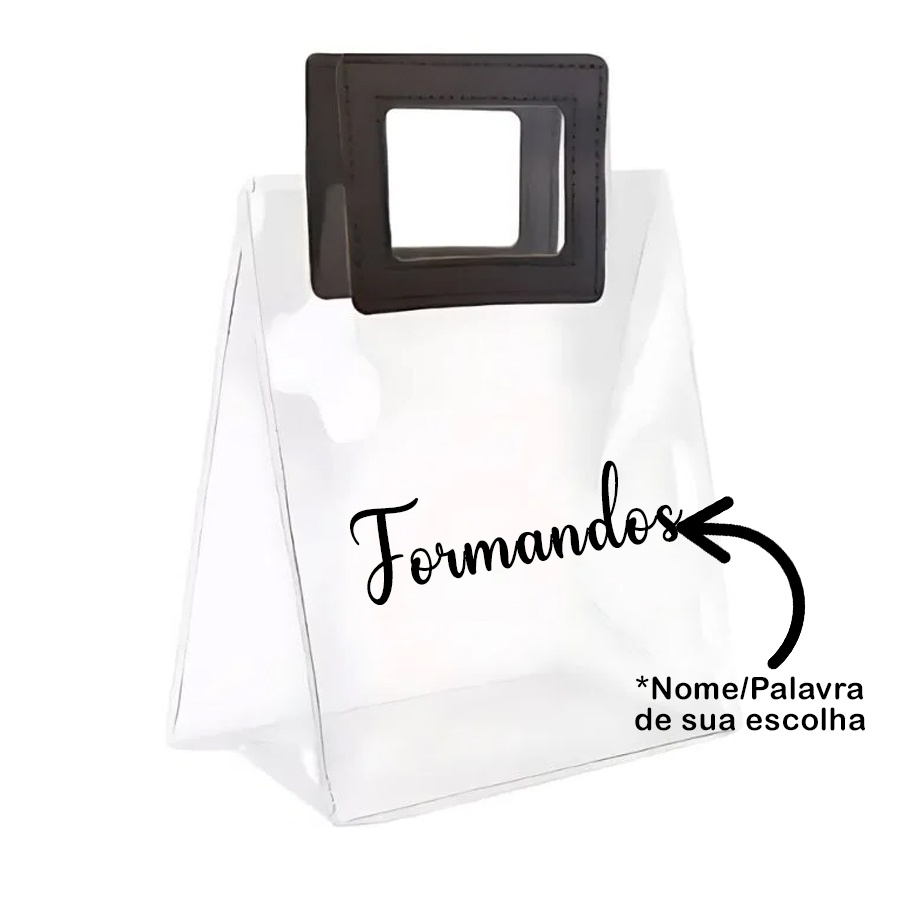 Sacola de plástico transparente com alça tipo couro quadrada, na cor preto, personalizada com nome ou palavra de sua escolha.
