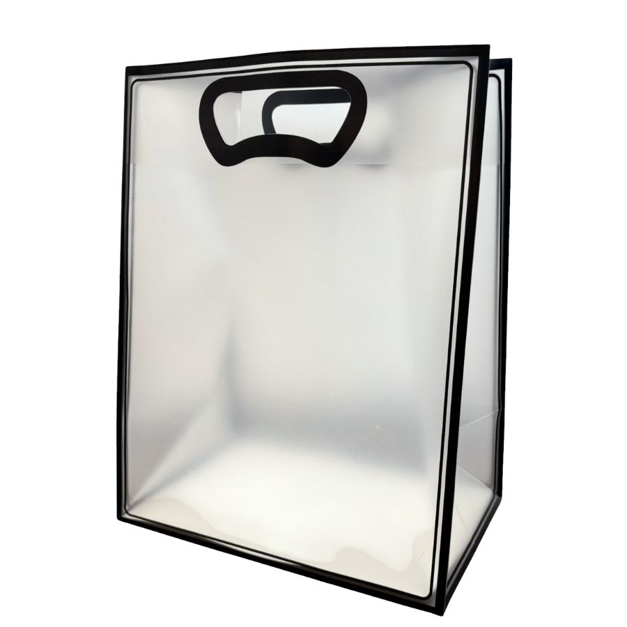 O Sacola Transparente Fosca PVC Alça Plana Preto - 40x30x12cm - 1 unidade é perfeita para quem busca embalagens resistentes, elegantes e práticas para presentes, lembrancinhas e produtos. Produzida em PVC fosco de alta qualidade, oferece durabilidade e acabamento sofisticado, enquanto as alças planas na cor preta garantem conforto e facilidade no transporte.