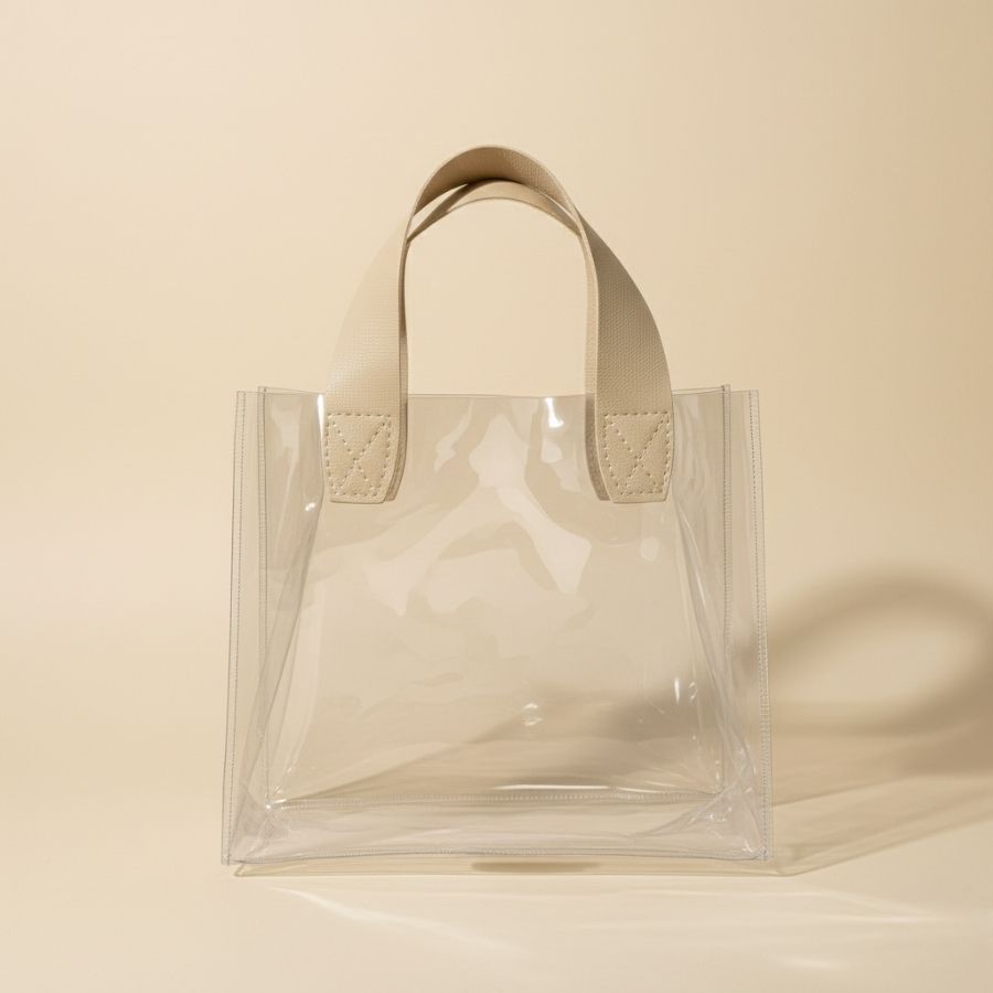 Sacola transparente em PVC com alça bege em PU, tamanho 25x14x23 cm, resistente e ideal para presentear, organizar e valorizar produtos de maior volume.