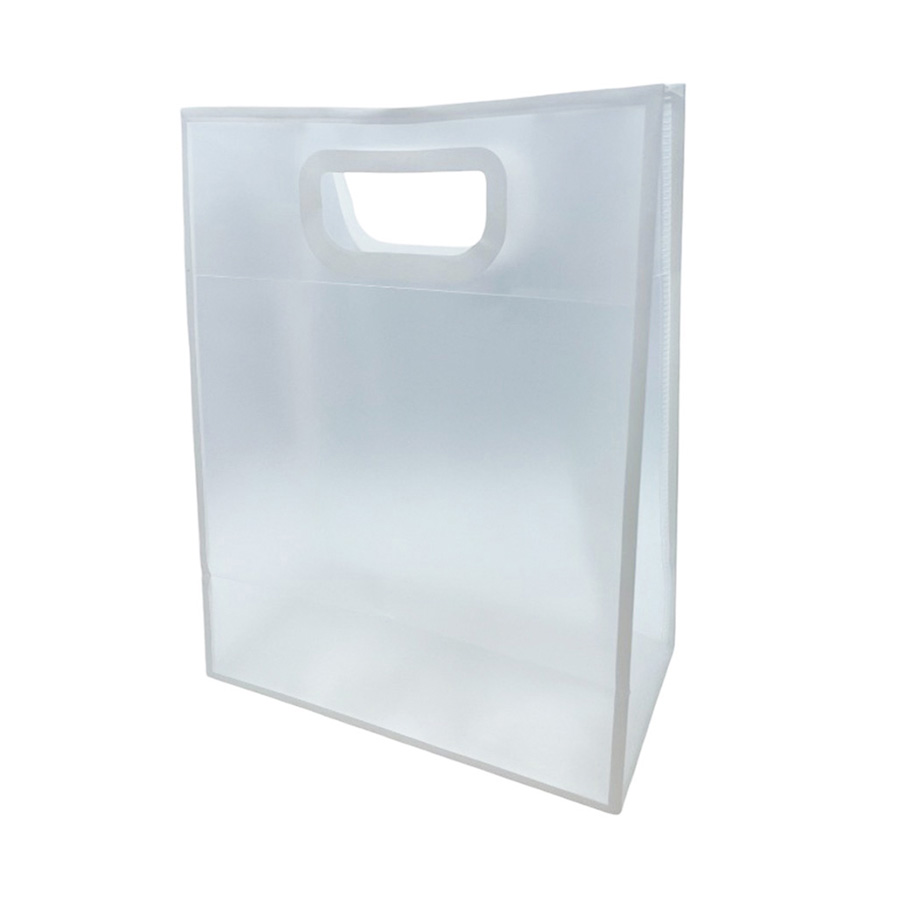 Sacola para presente de PVC, na cor transparente leitoso com bordas e alça embutida na cor branca.