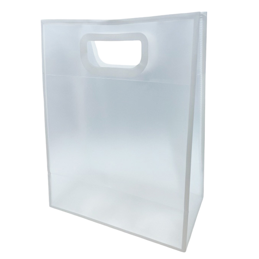 Sacola para presente de PVC, na cor transparente leitoso com bordas e alça embutida na cor branca.