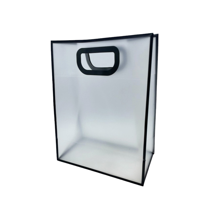 Sacola para presente de PVC, na cor transparente leitoso com bordas e alça embutida na cor preta.