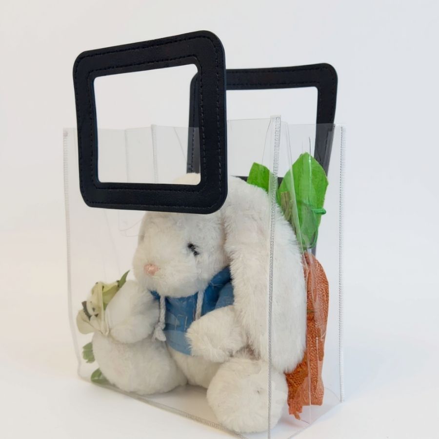 A Sacola Transparente Fosca PVC com alça retangular em couro azul escuro é resistente, prática e sofisticada, ideal para lembrancinhas, presentes e embalagens de festas e eventos.