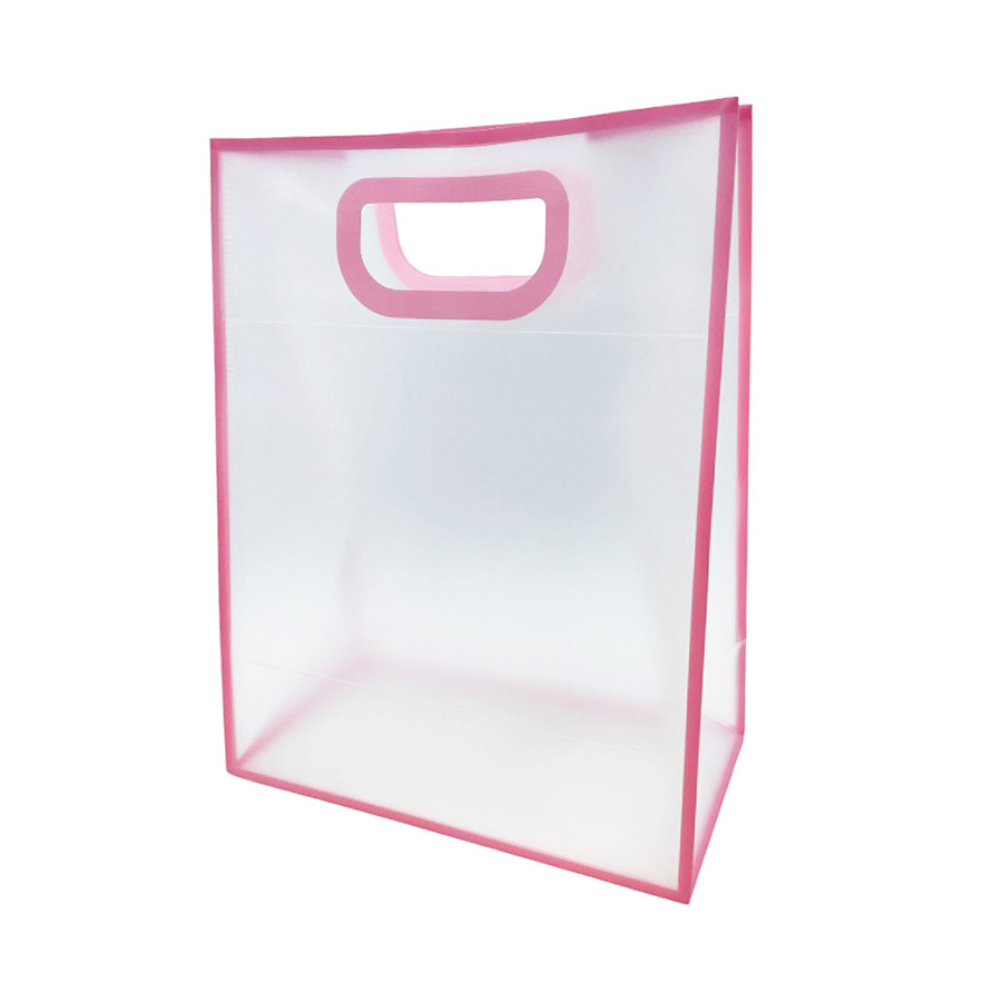 Sacola para presente de PVC, na cor transparente leitoso com bordas e alça embutida na cor rosa.