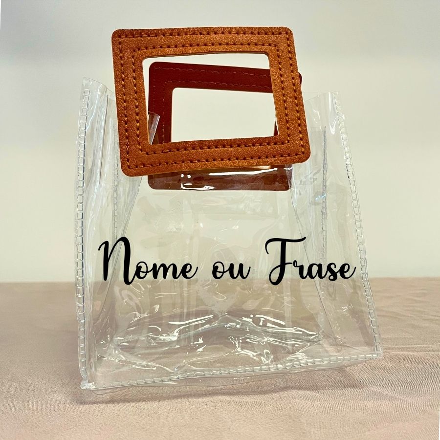 Sacola Transparente PVC Personalizado Escrita Preta com Alça Quadrada de Couro Marrom - 15x15x10cm - 1 unidade - Rizzo