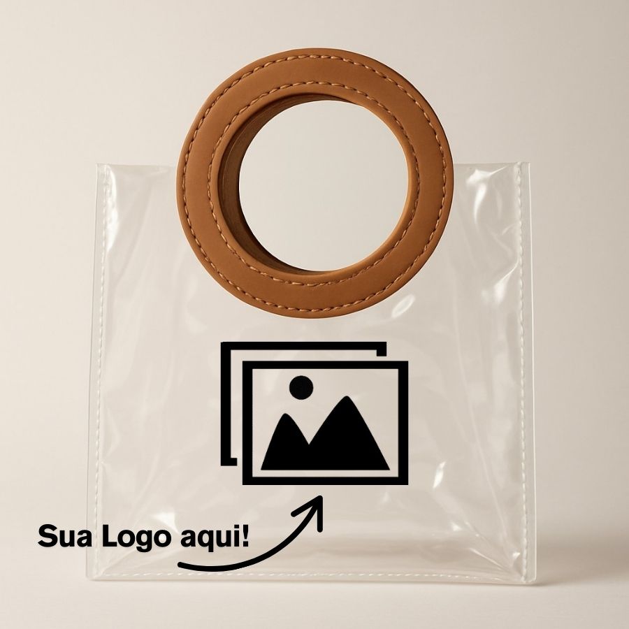Disponível com alça redonda ou quadrada em couro sintético nas cores verde musgo, marrom e preto, a sacola oferece praticidade e estilo. A transparência do PVC valoriza o conteúdo e a identidade da sua marca de forma moderna e impactante.